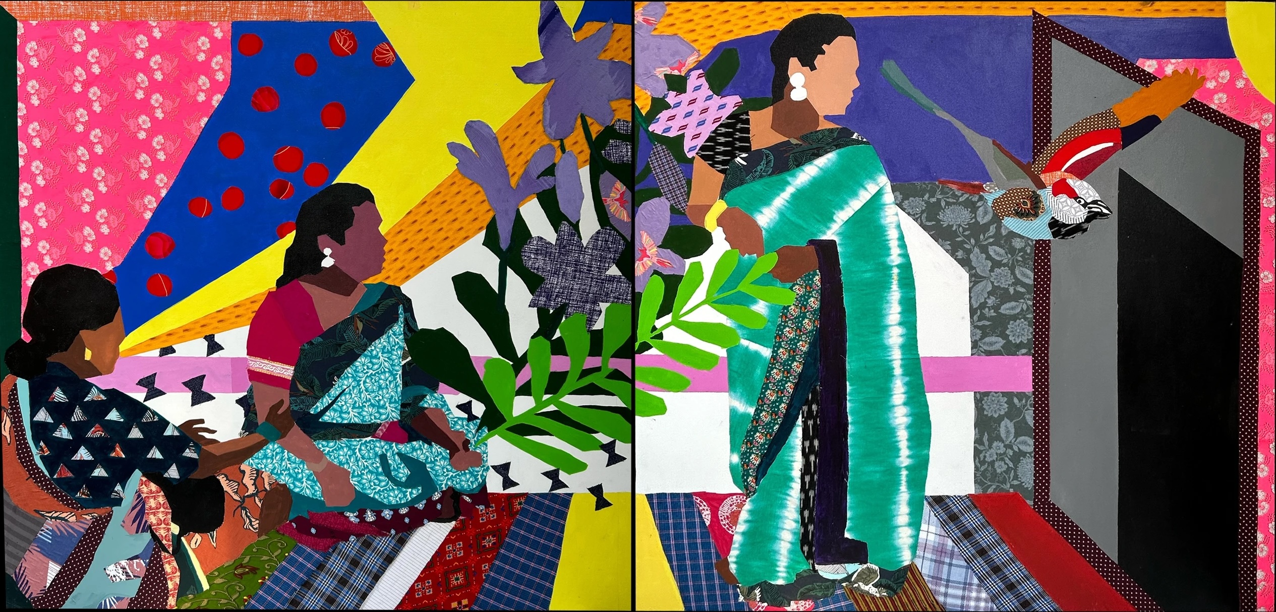 The Aravani Art Project, Leisurely Saree, Acrylic and textile on canvas, 122 x 244 cm, 2024